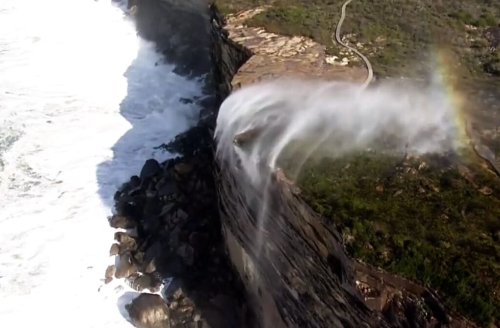 Condizione analoga – documentata anche qui da filmati condivisi sui social, che mostrano sovente forti correnti ascensionali – si rinviene muovendo verso Kurnell, nell’area meridionale del Kamay Botany Bay National Park di Sydney, dove per lo stesso motivo la cascata sulla scogliera modifica il suo corso e l’acqua sfida nuovamente la forza di gravità, con modalità sempre e solo naturali.